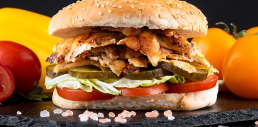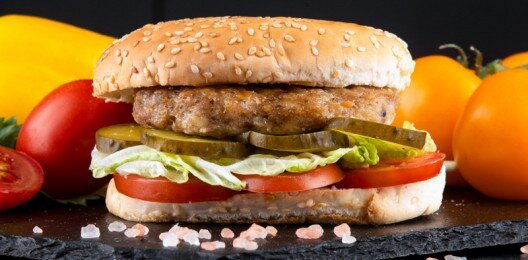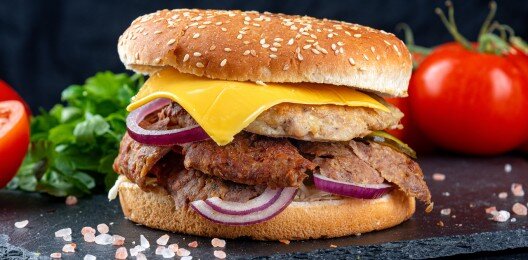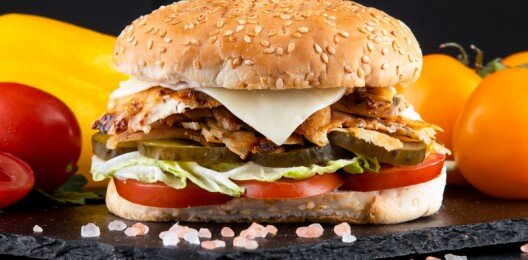 Булочка с кунжутом, котлета (свинина/курица), капуста, соленый огурец, томат, плавленый сыр, соус фирменный, соус «Бургер»