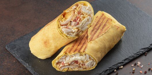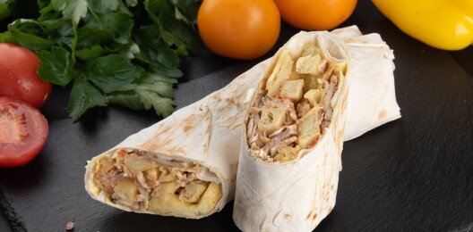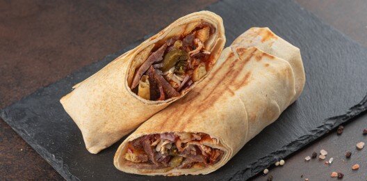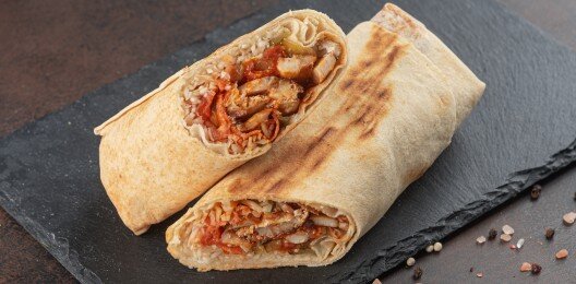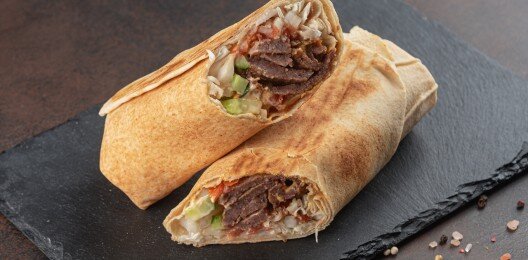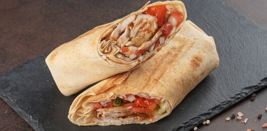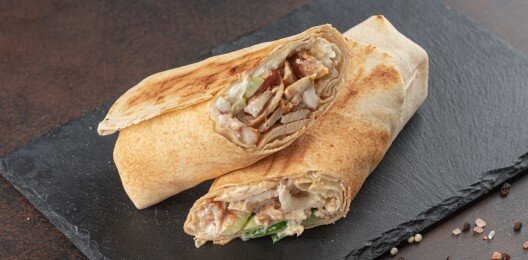 Лепёшка, говядина, курица, капуста, соленый огурец, томат, соус фирменный, соус Гриль, соус Горчичный