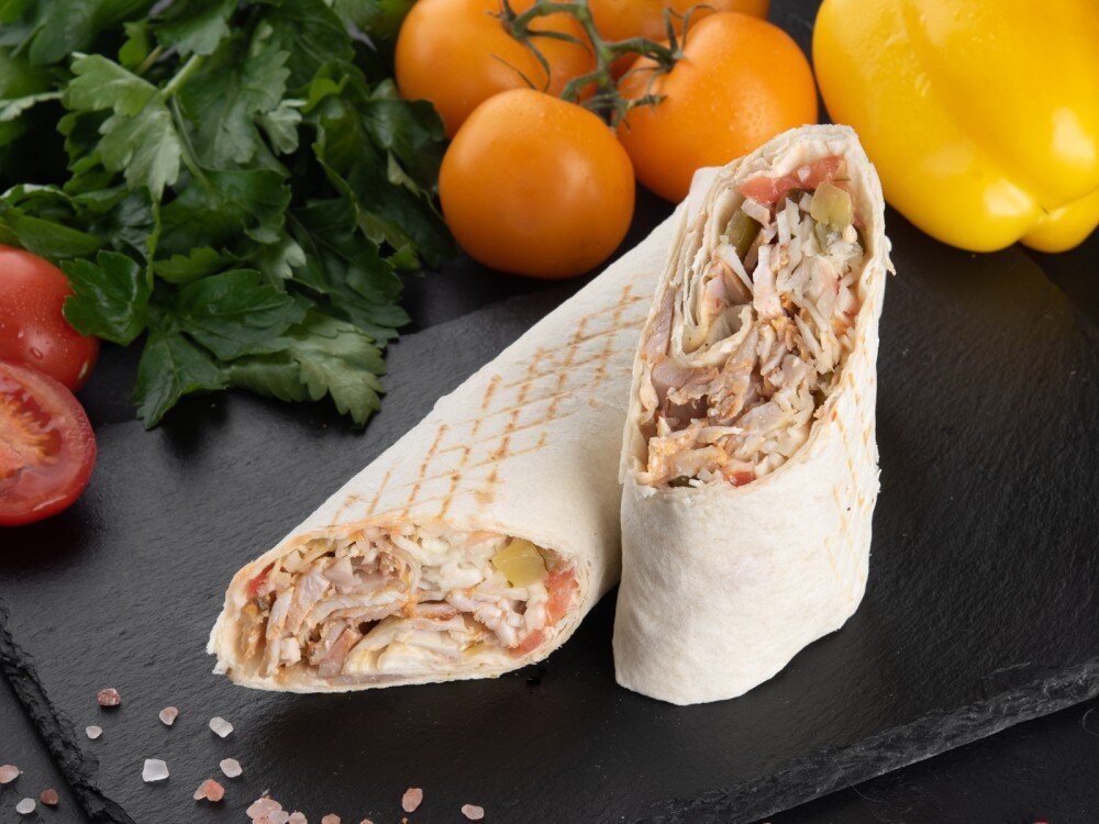 Лепёшка, курица, капуста, соленый огурец, томат, соус фирменный, соус «Барбекю»