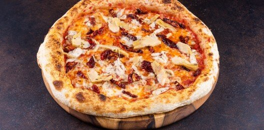 Тесто, соус помидорный , сыр моцарелла, сосиски, картофель фри